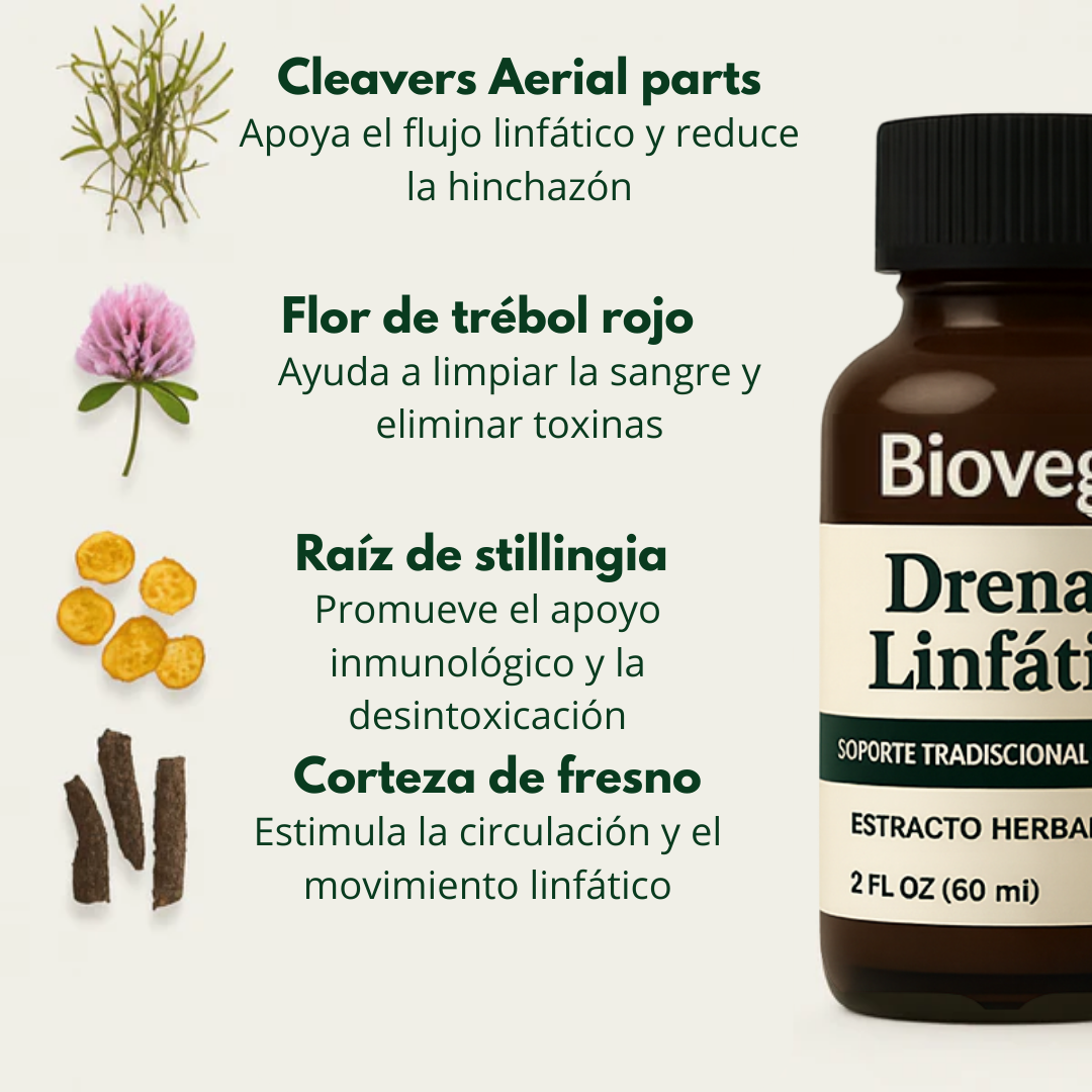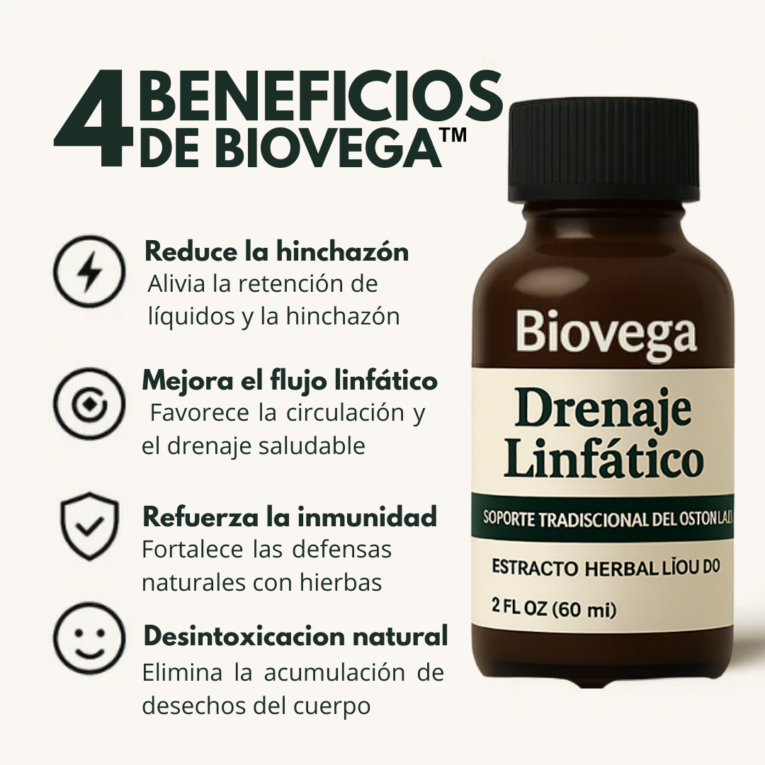 Cada gota de Biovega combina extractos herbales cuidadosamente seleccionados y respaldados por la tradición herbal para apoyar el drenaje linfático y el bienestar general: