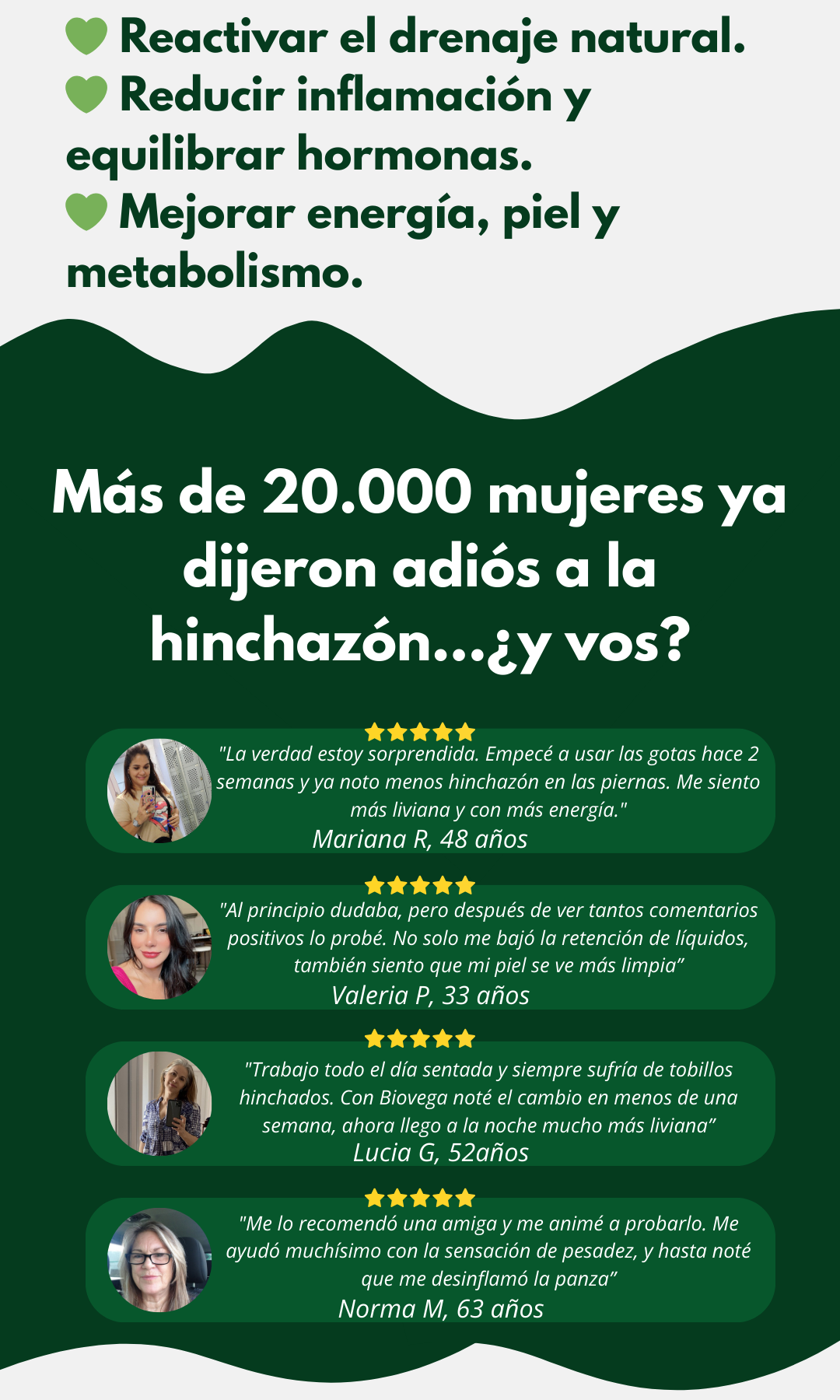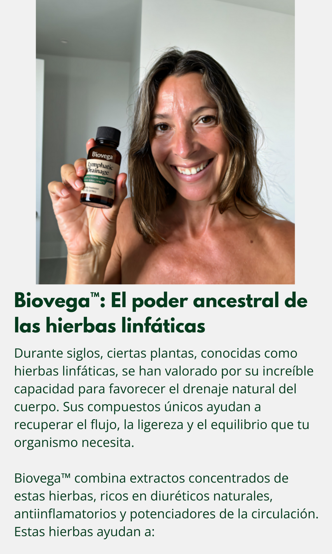 Biovega™ es un suplemento líquido natural diseñado para reactivar el flujo linfático,ayudando a tu cuerpo a drenar líquidos retenidos y reducir la hinchazón desde adentro.Con solo unas gotas al día, combate la pesadez, el abdomen inflamado y la retención en piernas y rostro, devolviéndote una sensación de ligereza y definición sin dietas extremas ni productos agresivos.